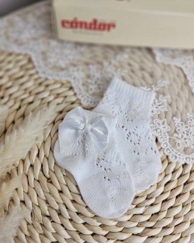 Skarpetki Condor ażurowe Perle z satynową kokardką - białe